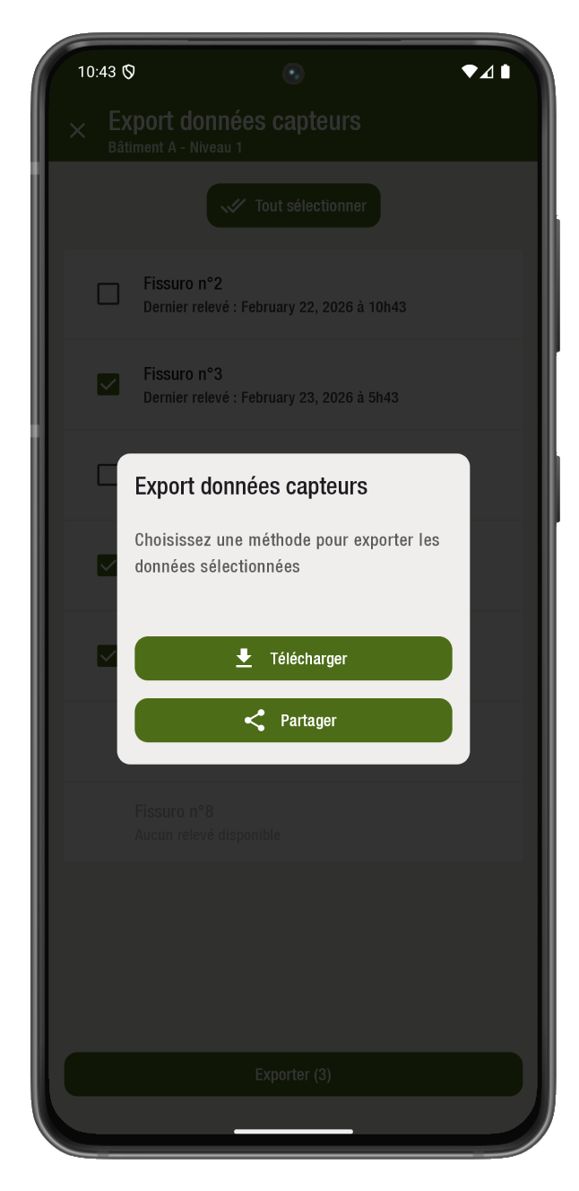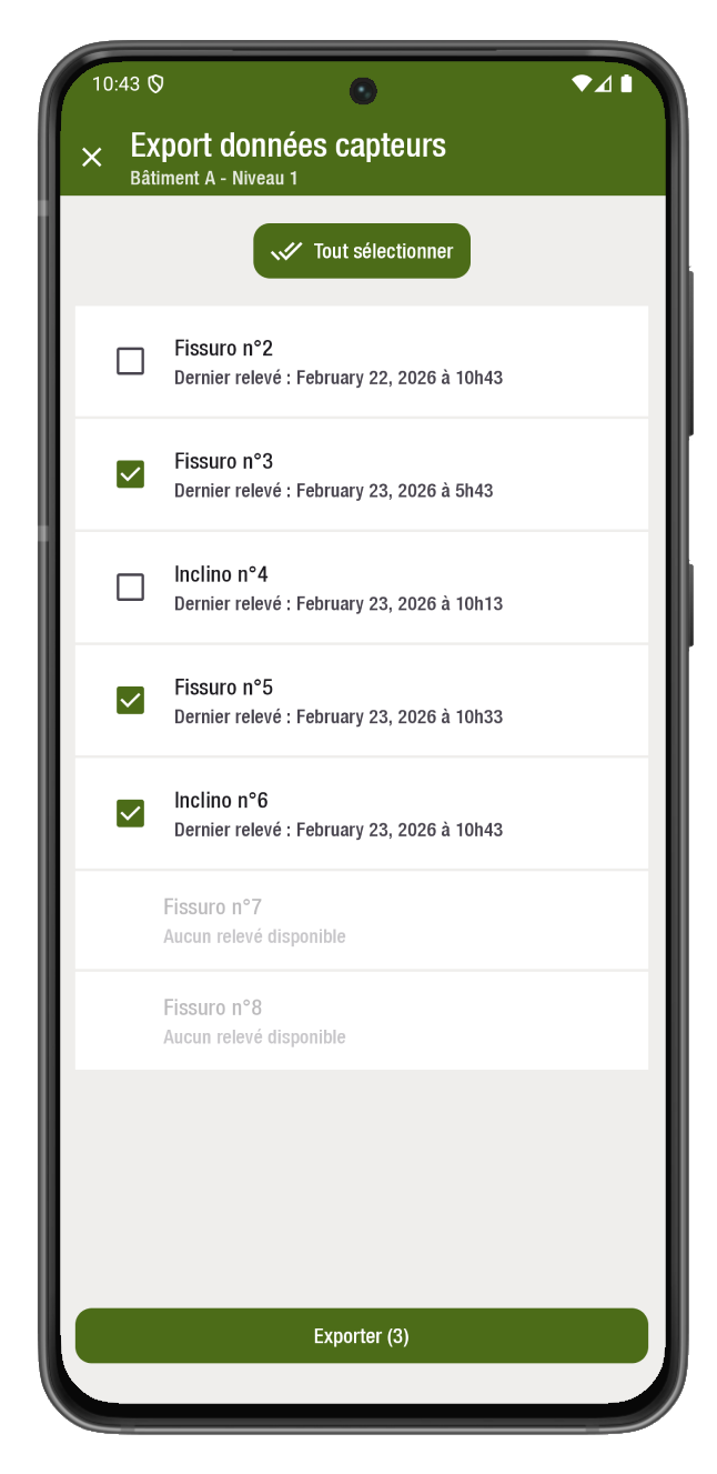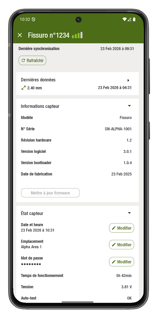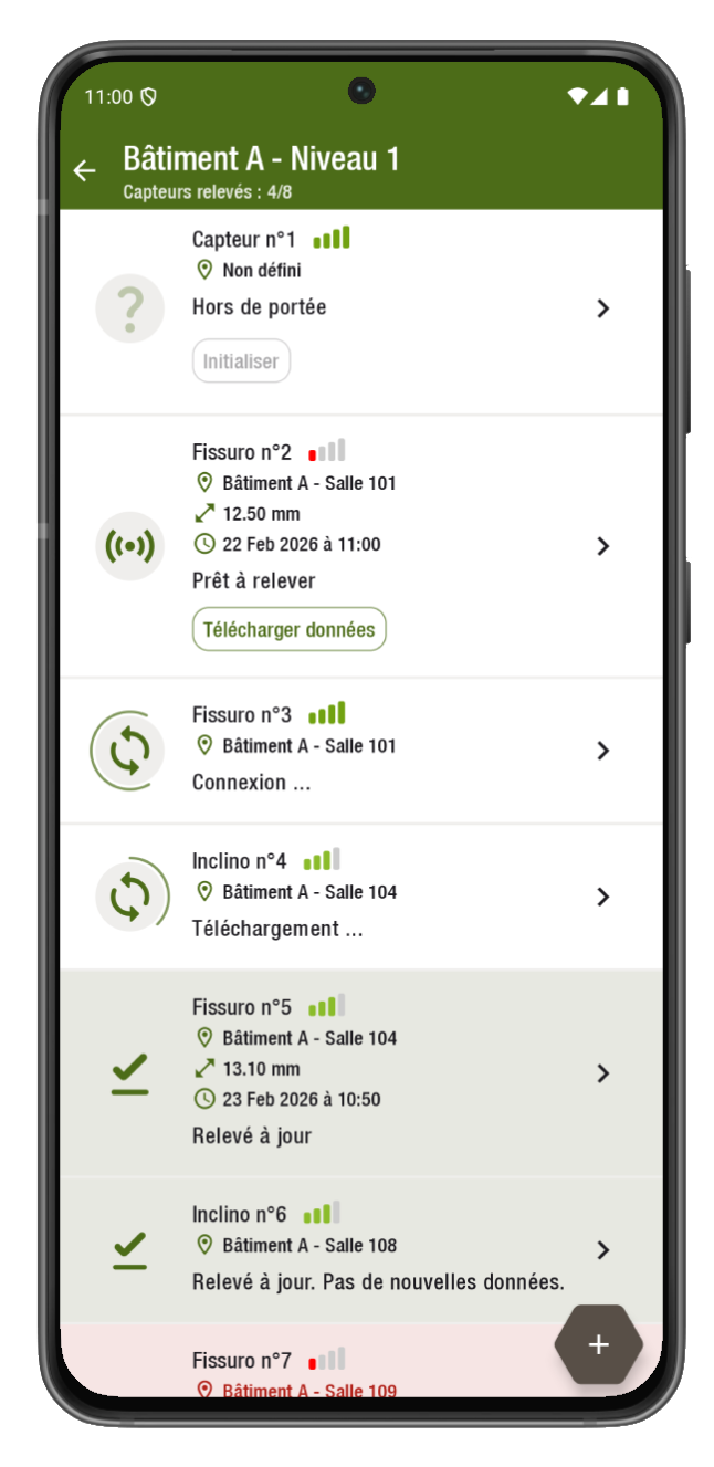 Application Android native pour le secteur BTP permettant à des techniciens de relever, paramétrer et monitorer des capteurs IoT (fissuromètres, inclinomètres) sur ponts et ouvrages, avec une interface utilisateur ergonomique et intuitive qui empêche les erreurs sur le terrain.