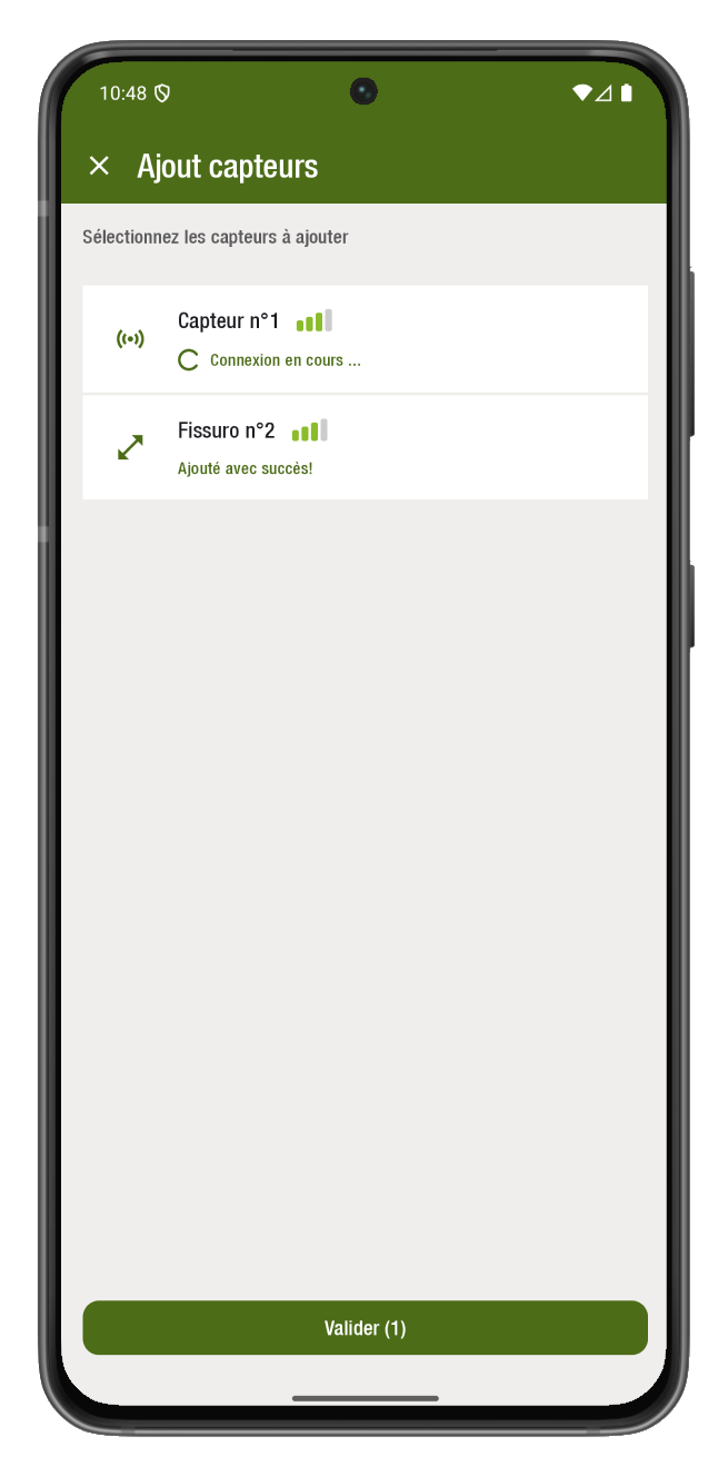 • Ajout de capteurs via numéro de série ou scan Bluetooth LE.